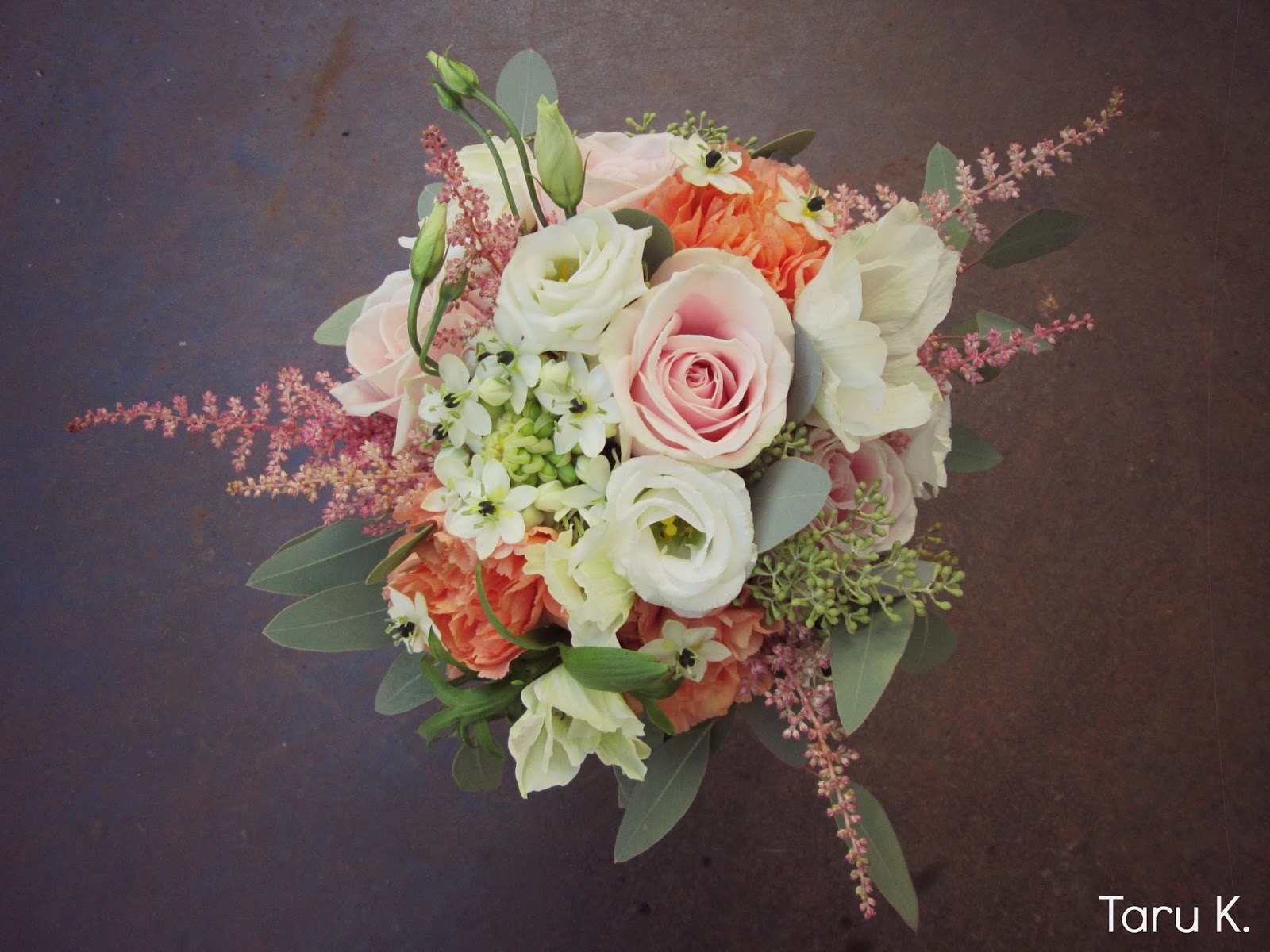 Light wedding bouquets are like picked from the garden. Roses, Lisianthus and Carnations... Astilbe and Eucalyptus can be a bit wild but it doesn't matter! Love this casual wedding look.